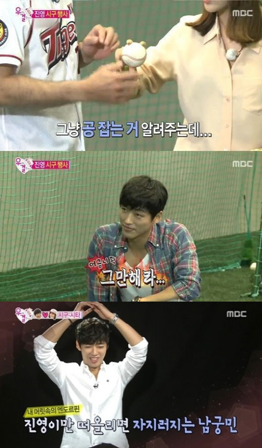 이날 시구자로 나선 홍진영은 KIA 타이거즈 서재응에게 야구공을 잡는 법을 배웠다. 이 과정에서 서재응과 홍진영의 손이 겹쳐졌고, 이를 지켜보던 남궁민은 질투어린 시선을 보여 웃음을 자아냈다.