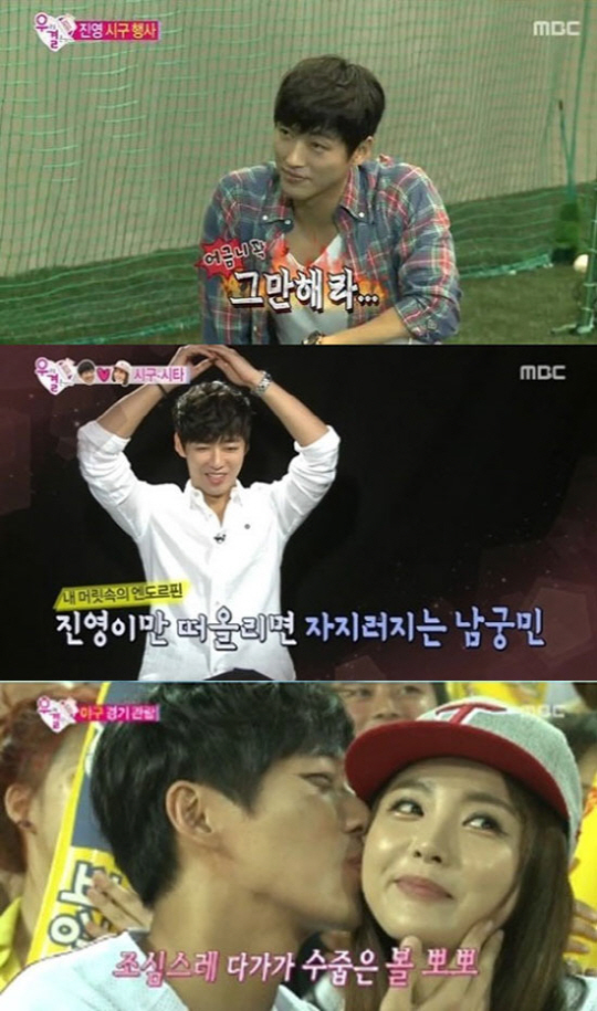 이날 시구자로 나선 홍진영은 KIA 타이거즈 서재응에게 야구공을 잡는 법을 배웠다. 이 과정에서 서재응과 홍진영의 손이 겹쳐졌고, 이를 지켜보던 남궁민은 질투어린 시선을 보여 웃음을 자아냈다.