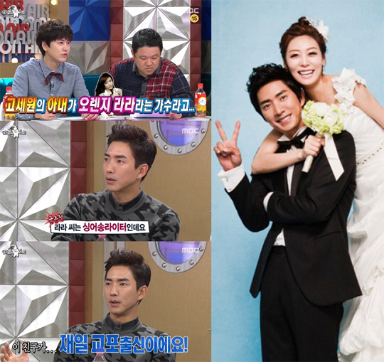 이날 MC들은 "고세원의 아내가 오렌지라라라는 가수라고 들었다"고 운을 뗐다. 이에 고세원은 "아내가 가수 활동을 할 당시 소속사가 오렌지펙토리라 오렌지라라라는 예명으로 활동했는데 지금은 소속사를 떠난 상태라 오렌지 빼고 라라가 됐다"고 답했다.
