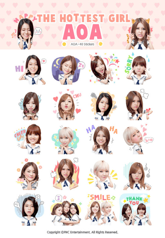 11일 공개된 AOA 카카오톡 스티커 이모티콘은 멤버들의 애교 만점 표정을 그대로 포착해 눈길을 끈다. '더 핫티스트 걸 에이오에이(The Hottest Girl AOA)'라는 이름으로 출시된 스티커 이모티콘은 총 40종으로 구성되어 있으며, 멤버 한 명 한 명의 리얼하고 익살스러운 표정이 생생히 살아있어 카카오톡 메신저 유저들에게 큰 사랑을 받을 것으로 기대된다.