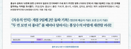 홍상수 감독의 16번째 장편 신작이자 일본의 연기파배우 카세 료가 주연한 영화 '자유의 언덕'이 개봉 9일째인 12일 오전 11시 2만 관객을 돌파하는 저력을 과시했다.