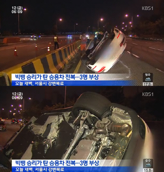 승리는 12일 새벽 3시30분 경 서울 강변북로 일산 방향 동부이촌동 신동아 아파트 앞에서 자신이 몰던 포르쉐 911로 옆 차선의 벤츠 승용차와 충돌한 뒤 중앙 가드레일을 들이 받고 전복되는 사고를 당했다.