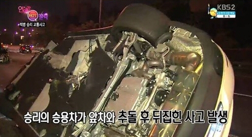 13일 방송된 KBS2 '연예가중계'에서는 승리의 교통사고를 목격한 사람의 증언이 전파를 탔다. 목격자는 "차가 가고 있었는데 승리의 차가 그 차를 앞질렀다. 그 차를 앞지르고 바로 사고가 났다. 아무 관계 없는 차를 하나 앞지르고 그 앞에 있는 차를 받아 버렸다"고 밝혔다.