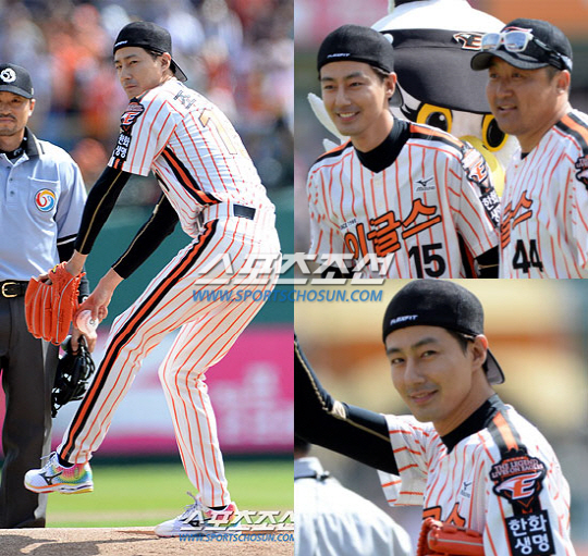 배우 조인성이 한와 이글스 조인성 선수와 함께 성공적인 시구를 마쳤다.
