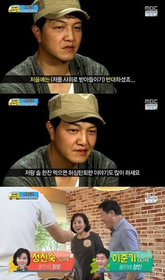 이날 정웅인은 "사실 반대가 심하셨다. 이제 대학 졸업을 앞둔 앞길 창창한 딸을 나이 많은 나에게 주려고 했으니 얼마나 아까웠겠느냐. 나도 그랬을 것이다. 첫 만남을 횟집에서 했었는데 장모님이 회를 한 점도 안드시더라"고 말했다.