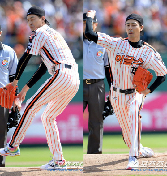 배우 조인성이 드디어 한화 포수 조인성과 함께 성공적인 시구를 마쳤다.