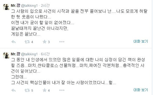 강병규는 "그 사람의 입으로 사건의 시작과 끝을 전부 들어보니 난… 나도 모르게 허탈한 헛웃음이 나왔다. 이젠 내가 굳이 할 일이 없어졌다. 끝날 때까지 끝난 건 아니라지만 게임은 끝났다" 등의 의미심장한 글을 올려 네티즌들의 이목을 집중시켰다.