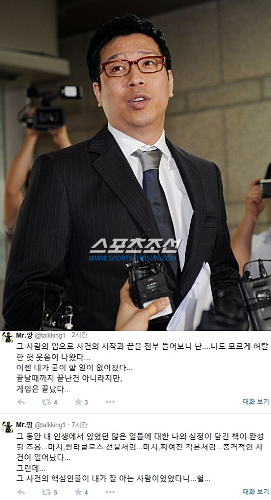 이와 관련 강병규는 지난 14일 자신의 트위터 계정에 "그동안 내 인생에서 있었던 많은 일들에 대한 나의 심정이 담긴 책이 완성될 즈음 마치 산타클로스 선물처럼 짜여진 각본처럼 충격적인 사건이 일어났다"며 "그 사건의 핵심 인물이 내가 잘 아는 사람이었다니 헐"이라는 글을 게재했다.