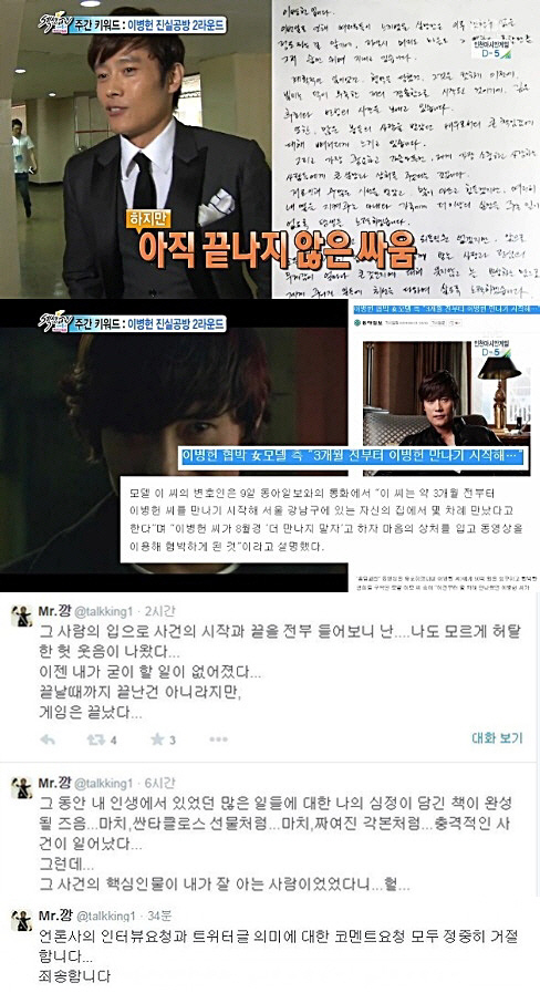 앞서 강병규는 지난 11일부터 이병헌 사건에 관련한 기사를 링크했고 또 이병헌을 협박한 여성 모델에 관한 네티즌 글을 링크하며 이 사건에 관심을 보였다.