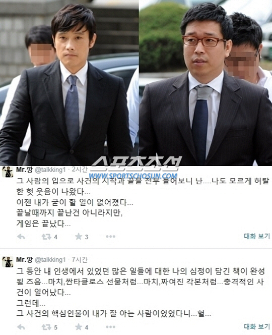 한편 강병규는 지난해 이병헌과의 갈등으로 트위터를 중단했지만 최근 이병헌과 다희, 모델 이지연 협박 사건을 계기로 트위터 활동을 재개했다.