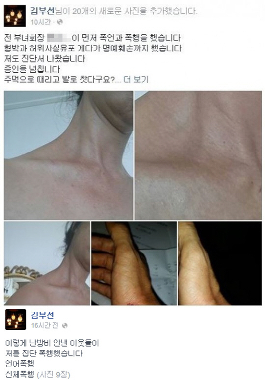 김부선은 14일 SNS를 통해 "전 부녀회장(A씨)이 먼저 폭언과 폭행을 했다. 협박과 허위사실 유포 게다가 명예훼손까지 했다"면서 "주먹으로 때리고 발로 찼다고? 녹취 다 있다. 나도 진단서 나왔다. 증인들도 넘친다"는 글과 함께 상처부위를 찍은 사진을 올렸다.
