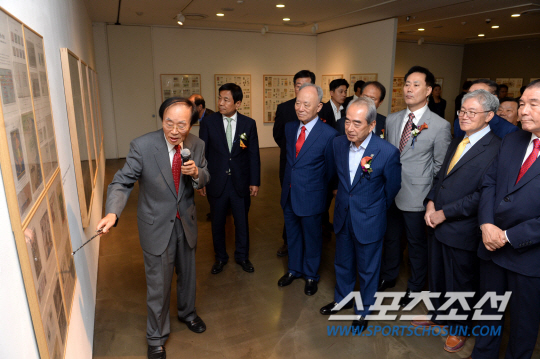 ◇제17회 인천 아시아경기대회 기념 국제 스포츠우표전시회(SPORTSASIANA 2014)가 16일 신세계백화점 인천점에서 개막했다. 허진도 한국 올림픽 스포츠우취회장(맨 왼쪽)이 김영수 인천아시아경기대회 조직위원장 등 내빈들에게 작품 설명을 하고 있다. 인천=허상욱 기자 wook@sportschosun.com