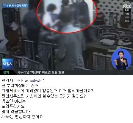 이어 그는 "JTBC, 제가 맞은 사진까지 있다고 했는데 어찌하여 그대는 그 중요한 자료를 외면하고 부녀회장 맞은 부위만 방송에 내보낼수 있냐. 나는 손목, 쇄골뼈, 목, 허리, 입안 터짐까지 비교가 안 되게 상처가 크다"고 억울함을 호소했다.