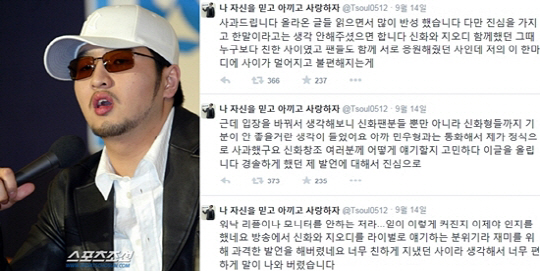 이어 그는 "근데 입장을 바꿔서 생각해보니 신화 팬분들 뿐만 아니라 신화 형들까지 기분이 안 좋을 거란 생각이 들었다"며 "아까 민우형과 통화해서 제가 정식으로 사과했고요. 신화창조 여러분께 어떻게 얘기할지 고민하다 이 글을 올립니다"라며 미안함을 전했다.