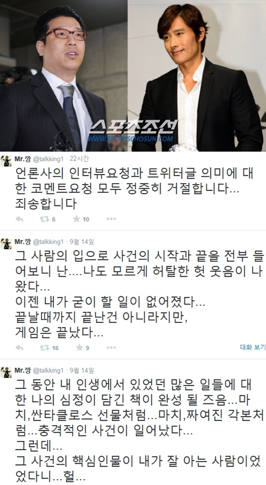 한편 많은 네티즌들은 "강병규, 이병헌 이지연 관련 의미심장한 글 궁금해", "강병규 이병헌 이지연 사건에 대해 뭔가 알고 있나", "강병규 이병헌 이지연 사건에 관심 보일 줄 알았다", "강병규 이병헌 이지연 사건 진실이 궁금하다", "강병규 이병헌 이지연 협박사건 얼마나 알고 있을까"등의 반응을 보이고 있다. <스포츠조선닷컴>