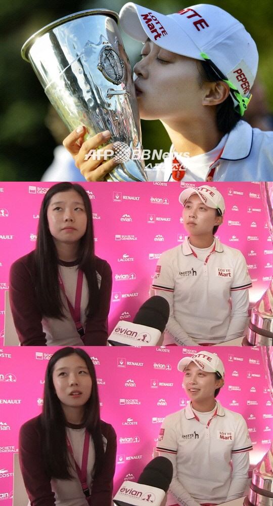 김효주 동생 통역 김효주가 15일 미국여자프로골프(LPGA) 투어 메이저대회인 에비앙 챔피언십에서 우승한 뒤 트로피에 입을 맞추고 있다. ⓒAFPBBNews = News1 |