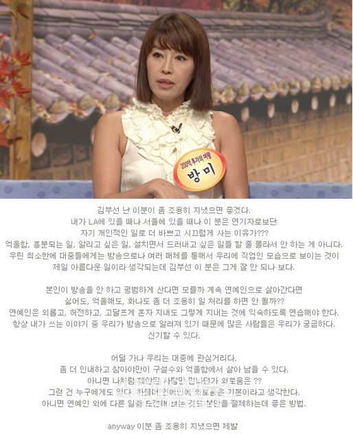 방미는 "억울함, 흥분되는 일, 알리고 싶은 일, 설치면서 드러내고 싶은 일들 할 줄 몰라서 안 하는 게 아니다"며 "우린 최소한 대중들에게는 방송으로나 여러 매체를 통해서 직업인 모습으로 보이는 것이 제일 아름다운 일이라 생각되는데 김부선 이 분은 그게 잘 안 되나 보다"라며 김부선에게 일침을 날렸다.
