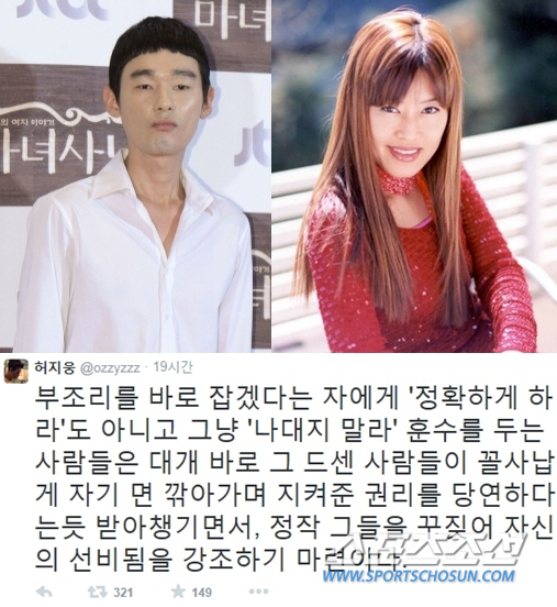 허지웅은 16일 자신의 트위터를 통해 "부조리를 바로 잡겠다는 자에게 '정확하게 하라'도 아니고 그냥 '나대지 말라' 훈수를 두는 사람들은 대게 바로 그 드센 사람들이 꼴사납게 자기 면 깎아가며 지켜준 권리를 당연하다는 듯 받아 챙기면서, 정작 그들을 꾸짖어 자신의 선비 됨을 강조하기 마련이다"라고 말했다.