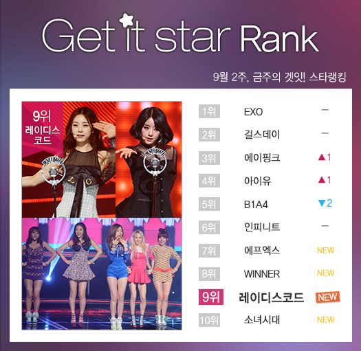 겟잇스타 랭킹 2014년 9월 2주차는 지난 3일, 새벽 불의의 교통사고를 당한 레이디스코드 멤버 故은비, 리세를 향한 추모의 물결이 이어졌습니다. 이에 힘입어 레이디스코드는 TOP 10에 진입, 9위에 올랐네요. 이를 통해 많은 겟잇스타 회원이 애도와 나머지 멤버들을 향한 격려 메시지를 표시했음을 알 수 있었습니다.