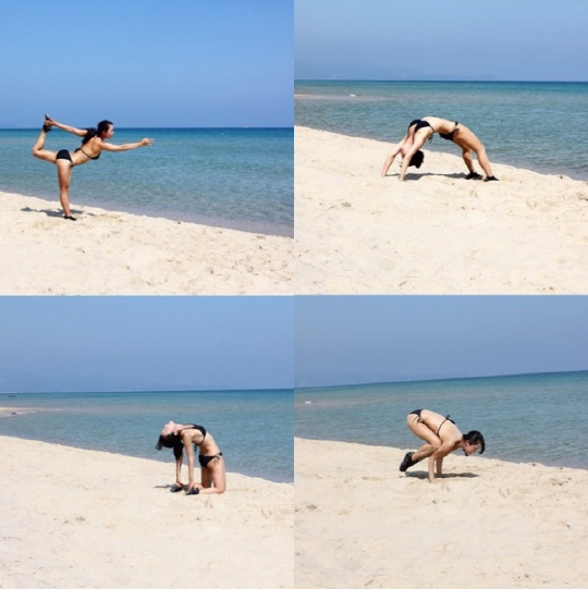 배우 윤진서가 해변에서 비키니 차림으로 고난이도 요가 동작을 선보였다.