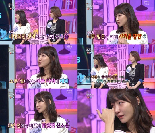 이날 신소율은 "스무살 때 데뷔를 했는데 사람을 너무 믿은 나머지 사기를 당했었다"며 "기획사 사기를 두 번이나 당했다"고 말문을 열었다.