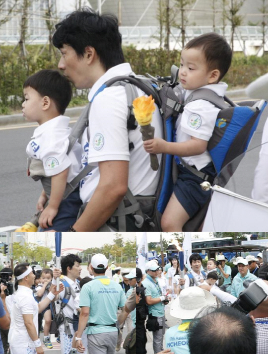 특히 송일국은 세 쌍둥이 대한, 민국, 만세를 업고 성화봉송에 참여한 것으로 알려져 더욱 눈길을 끈다.