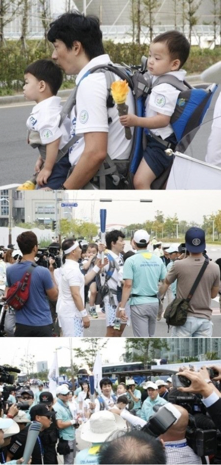 특히 송일국은 세쌍둥이를 각각 앞뒤로 업고 안은 채 성화 봉송에 참여하고 있어 많은 이들의 시선을 집중시켰다.