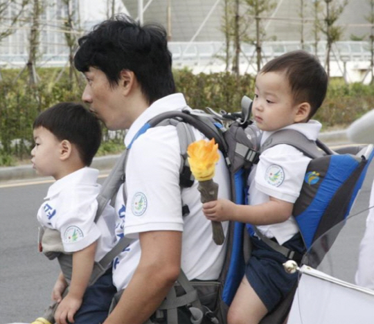 이날 2010 벤쿠버 동계 올림픽 여자 쇼트트랙 은메달리스트 이은별로부터 성화를 전달받은 송일국은 세쌍둥이를 각각 앞뒤로 업고 안은 채 성화 봉송에 참여해 많은 이들의 환호와 박수갈채를 받았다.