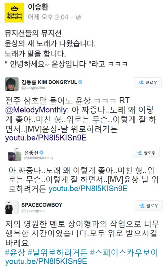 윤종신의 글을 리트윗한 김동률은 "전주 3초만 들어도 윤상"이라며 반가움을 표시했다. '날 위로하려거든' 작업에 참여한 가수 스페이스 카우보이 역시 자신의 트위터에 "저의 영원한 멘토 상이형과의 작업은 정말 행복한 시간이었습니다. 모두 위로 받으시길 바라요"라는 작업 후기를 남겼다.