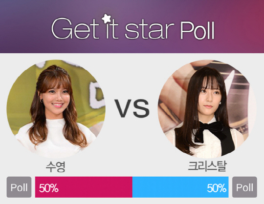 스타 스타일 매거진 어플리케이션 '겟잇스타'의 'Get it Star POLL' 의 117번째 대결은 '연기돌'로 변신한 여자 아이돌 수영(소녀시대) vs 크리스탈(에프엑스)의 대결입니다! 117번째 대결을 소개하기에 앞서, 지난주부터 진행된 116번째 대결의 진행 상황을 잠시 살펴볼까요. 9월 컴백 아이돌스타 대결은 2PM(34%) vs 틴탑(66%)으로 틴탑이 앞서가고 있습니다. 그렇지만 아직 시간이 남았으니 2PM 팬들도 서둘러 투표에 참여해주세요!