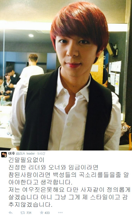 현재 소속사 대표와 관련된 글은 대부분 삭제된 상태며 "긴말 필요 없이 진정한 리더와 오너와 임금이라면 참된 사람이라면 백성들의 곡소리를 들을 줄 알아야한다고 생각합니다. 저는 여우 짓은 못해요 다만 사자같이 정의롭게 살겠습니다. 아니 그냥 그게 제 스타일이고 감추지 않겠습니다"라는 글이 남아 있다.