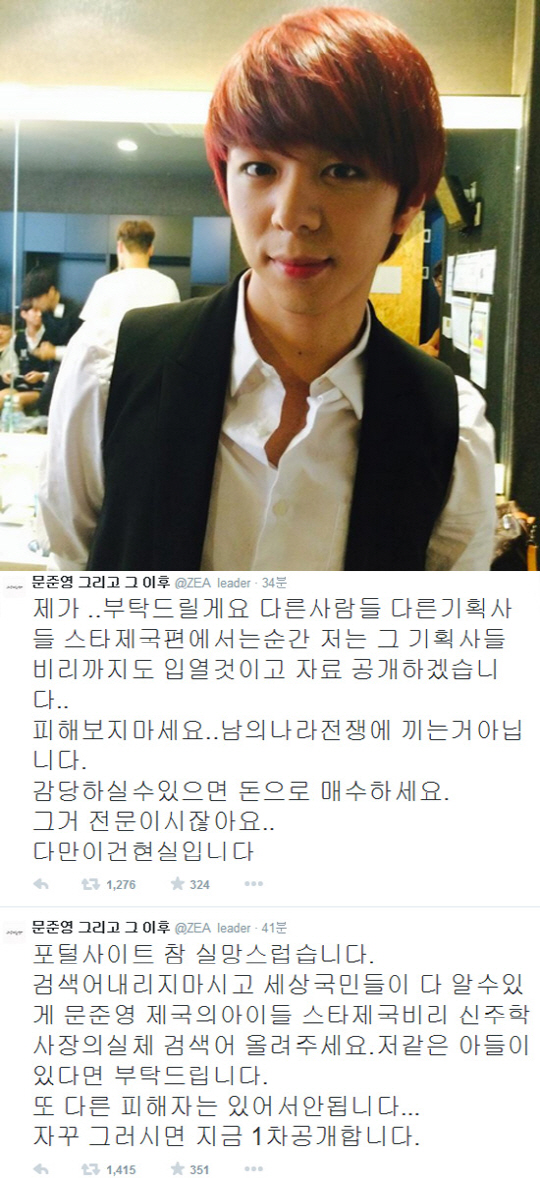 또 문준영은 "포털사이트 참 실망스럽습니다. 검색어 내리지마시고 세상 국민들이 다 알 수 있게 문준영 제국의아이들 스타제국비리 신주학사장의실체 검색어 올려주세요. 저 같은 아들이 있다면 부탁드립니다. 또 다른 피해자는 있어서 안됩니다. 자꾸 그러시면 지금 1차공개합니다"라며 강경한 태도를 보였다.