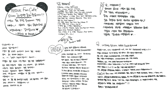 에이핑크는 지난 22일 오후 자신들의 다음 공식 카페(cafe.daum.net/apink) 가입 회원수가 10만명을 넘어섰다는 소식을 접했다. 기쁜 소식을 접한 초롱 은지 보미 나은 남주 하영 등 6명의 멤버들은 '팬덤 10만명 돌파'를 기념하기 위해 정성스럽게 써내려간 손 편지를 이날 팬 카페에 게재하며 팬들과 즐거움을 만끽하고 있다.