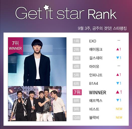 겟잇스타 랭킹 2014년 9월 3주차는 YG엔터테인먼트의 신인그룹 WINNER(이하 '위너')의 상승세가 돋보이는 한 주였습니다. 신인임에도 불구하고 순위권 진입은 물론, 매주 한 단 순위 상승을 하며 상위권 진입을 노리고 있네요.