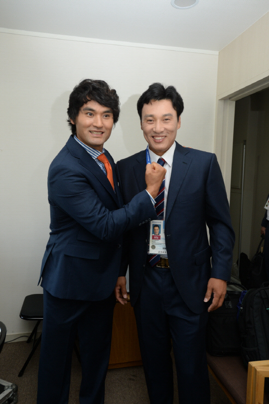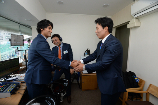 아시안게임 야구 대표팀 대만전이 열리는 24일 문학구장. 박찬호는 SBS 해설위원으로, 이승엽은 KBS 해설위원 신분으로 야구장을 찾았다. 유니폼 대신 해설용 정장 차림으로 조우한 두 거물. 만남은 후배 이승엽이 인사 차 선배를 찾아오면서 이뤄졌다. 정우영 캐스터, 이순철 해설위원 등 SBS 중계팀과 함께 문학구장에서 도착한 박찬호는 중계부스에서 최근 대만 경기 영상을 보며 전력분석 중이었다. 선배의 도착 사실을 전해 들은 이승엽은 SBS 중계부스로 박찬호를 찾아왔다. 후배의 깜짝 방문에 박찬호는 크게 반가워하며 근황을 묻는 등 환담을 이어갔다. 이 자리에서 이승엽은 최근 전화 연결 실패에 대한 해명(?)도 했다. 박찬호가 건 전화를 받지 못한 데 대해 이승엽은 "경기를 앞두고 연습 중 이었기 때문"이라고 설명했다. 이에 박찬호는 이승엽 선수의 손을 꼭 잡고 "중계방송 지켜볼게, 매끄럽게 진행 잘해"라며 우정을 담은 당부를 전했다.