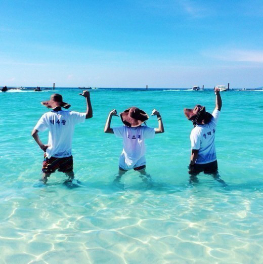 사진에는 에메랄드 빛의 바다에 들어간 세 사람이 뒤돌아 포즈를 취하고 있는 모습이 담겨 있다. 최근 종영한 SBS 드라마 '괜찮아, 사랑이야'에서 박수광, 오소녀, 양태용 역을 맡은 이광수, 이성경, 태항호는 각자 극 중 배역 이름이 적힌 티셔츠를 입고 개성 넘치는 포즈를 취했다.