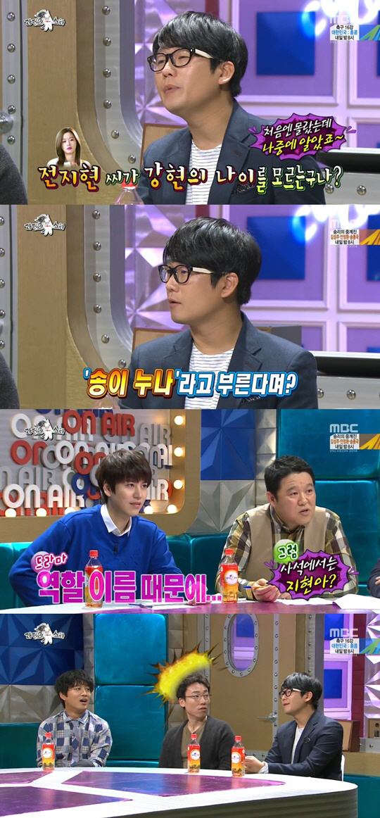 이날 MC은 "김강현 씨가 나이를 잊고 사나 보다. 전지현씨보다 4살이 많은데 전지현 씨를 송이누나라고 불렀다"며 질문을 던졌다.