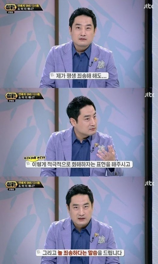 강용석은 25일 종합편성채널 JTBC '썰전'에서 최근 이지애의 화해 요청에 대해 "내가 평생 죄송해해도 모자라고, 늘 죄송하게 생각하는 부분"이라고 운을 뗐다.