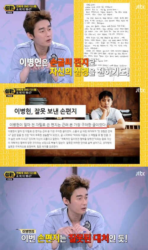 또 김구라는 "이병헌이 손편지를 여태까지 계속 써왔다. 그동안은 손편지로 대중들의 마음을 얻었지만 이번에는 여론이 확 변했다"라며 "순애보를 상징하는 손편지가 자신의 변명을 하는 것으로 비치니까 오히려 역효과가 나지 않았나 싶다"고 말했다.