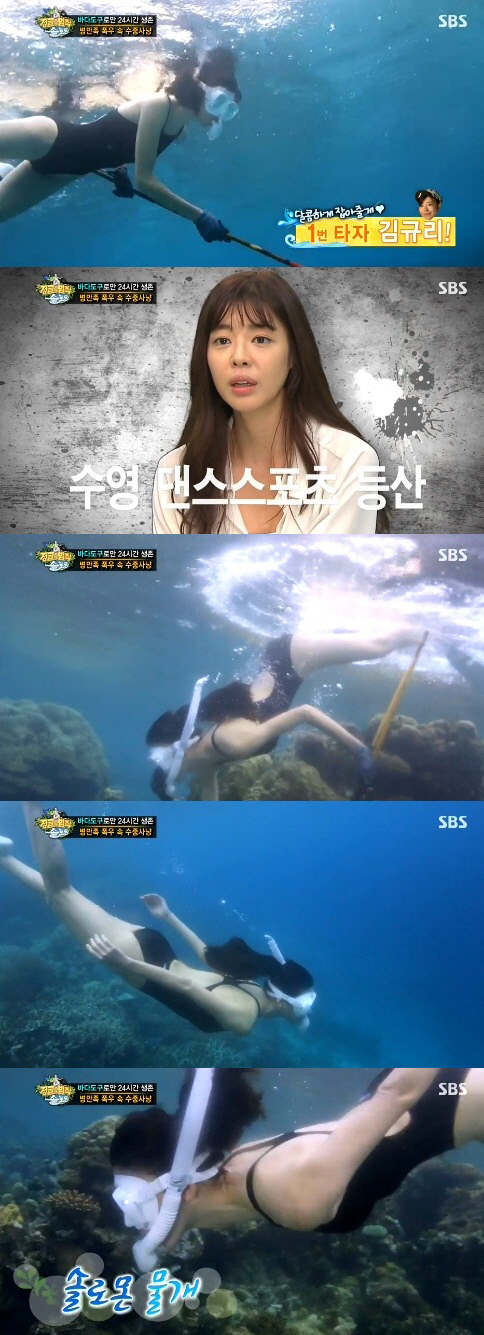 특히 김규리는 검정색 수영복으로 갈아입은 뒤 작살을 들고 물속으로 누비며 늘씬한 몸매를 드러냈다.
