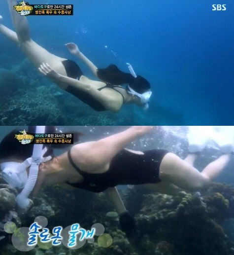 등을 드러낸 원피스 수영복 차림의 김규리는 늘씬한 S라인을 드러내며 인어 못지 않은 수영 실력을 뽐냈다.