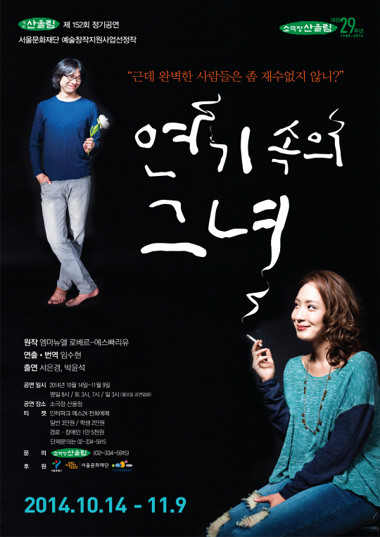 극단 산울림의 '연기 속의 그녀'는 프랑스의 젊은 작가 엠마뉴엘 로베르-에스빠리유의 재치 넘치는 로맨스다.
