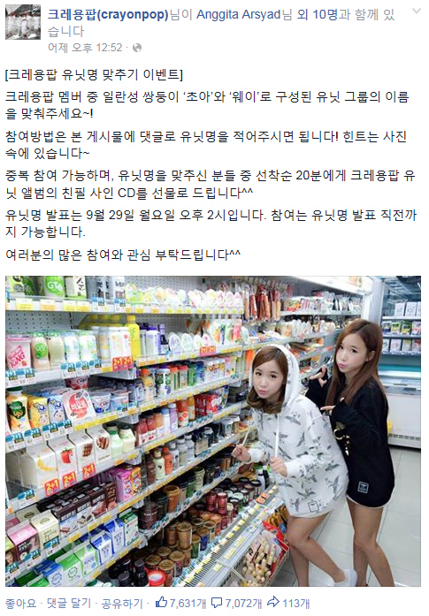 이번 이벤트는 초아와 웨이가 편의점 음료 코너 앞에서 포즈를 취하는 모습의 힌트가 담긴 사진을 보고 댓글로 유닛명을 맞추는 방식의 이벤트다. 유닛명을 맞춘 선착순 20명에게는 10월 중 발매될 크레용팝 유닛 데뷔 앨범의 친필 사인 CD를 선물로 증정한다.