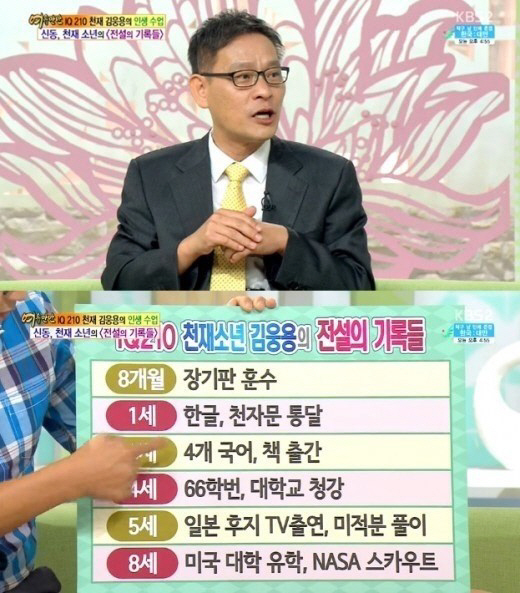 또한 이날 MC 조영구는 1978년판 세계 기네스북 책을 꺼내들며 김웅용의 천재성을 칭찬해 눈길을 끌었다. 책에는 김웅용의 4살 당시 사진과 함께 'IQ 210의 한국 소년은 4년 8개월의 나이에 4개의 언어를 말하며 동시를 짓고 적분을 풀 수 있다'는 내용이 기재돼 있어 시선을 모았다.