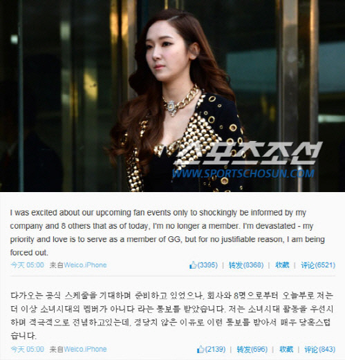 한편, 제시카의 웨이보에 해당 글이 올라온 이날 오전 제시카를 제외한 소녀시대 멤버 8명만이 팬미팅을 위해 중국으로 출국하는 모습이 포착됐다.