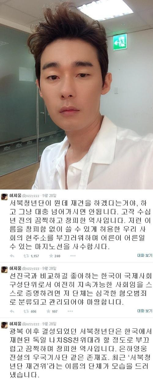 허지웅은 지난 28일 자신의 트위터 계정에 "광복 이후 결성됐던 서북청년단을 한국에서 재현된 독일 나치친위대라 할 정도로 부끄럽고 끔찍하며 창피한 역사다. 은하영웅전설의 우국기사단 같은 존재. 최근 '서북청년단 재건위'라는 이름의 단체가 모습을 드러냈다"고 말문을 열었다.