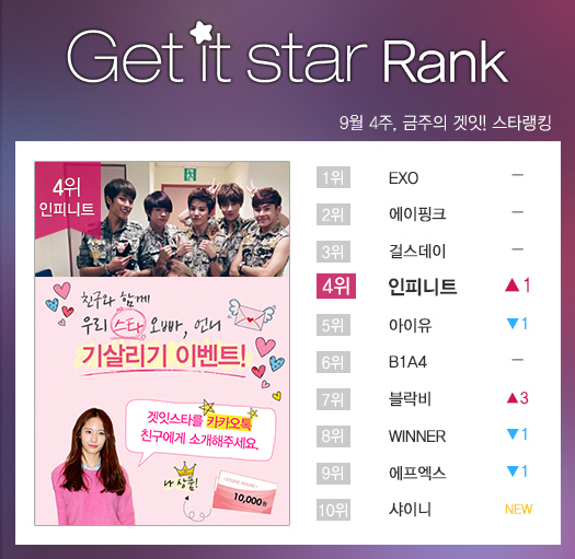 겟잇스타 랭킹 2014년 9월 4주차에서도 EXO가 누적 랭킹 1위를 놓치지 않았습니다. 하지만, 걸그룹 에이핑크와 걸스데이의 강세로 EXO는 일일 랭킹 3위까지 내려가며 어느 때보다 순위싸움이 치열하게 전개됐던 한 주였습니다.