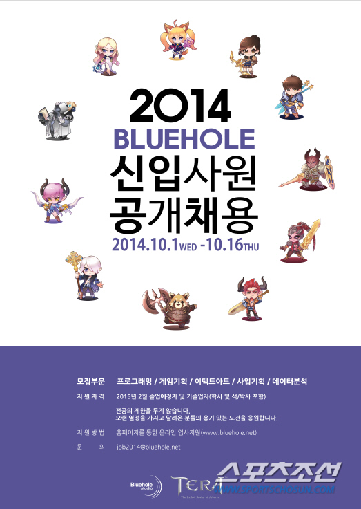 MMORPG '테라'를 만든 블루홀스튜디오는 2014년 신입사원 공개채용을 실시한다. 블루홀의 이번 공개채용은 지난해에 이어 두번째이다.