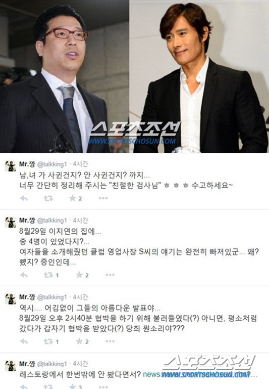 이어 그는 "8월 29일 이지연의 집에 총 4명이 있었다지? 여자들을 소개해줬던 클럽 영업사장 S씨의 얘기는 완전히 빠져있군 왜 뺐지? 증인인데"라며 "남녀가 사귄건지? 안 사귄건지? 까지 너무 간단히 정리해 주시는 '친절한 검사님' 수고하세요"라고 전했다.