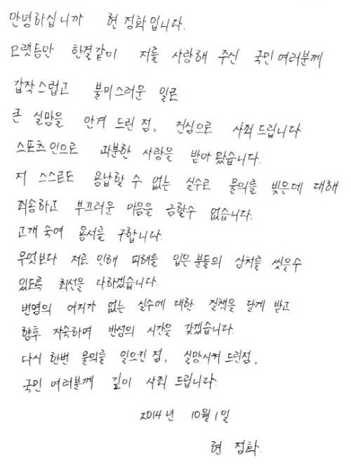 끝으로 "변명의 여지가 없는 실수에 대한 질책을 달게 받고 향후 자숙하며 반성의 시간을 갖겠습니다. 다시한번 물의를 일으킨 점, 실망시켜 드린 점, 국민 여러분께 깊이 사죄드립니다"라고 덧붙였다.